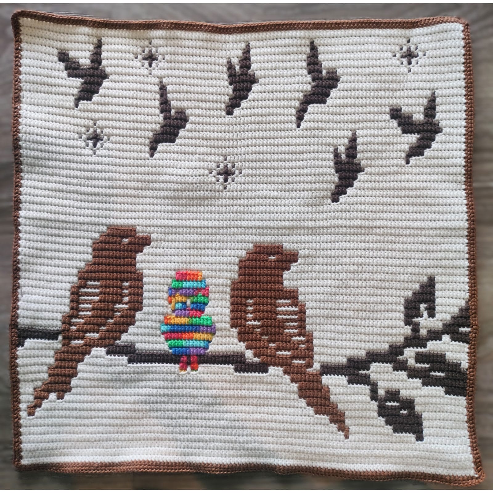 - Omdat je steeds aan de goede kant werkt, ziet de achterkant er vaak rommelig uit (met draadjes en onregelmatigheden). Dat is prima voor wanddecoratie of een kussen, maar als je een deken haakt, wil je misschien de achterkant afwerken met een voering of een effen gehaakt achterpaneel.