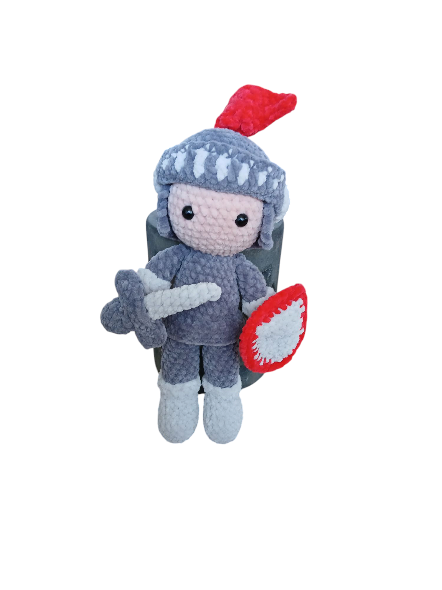De ridder wordt ongeveer 25 cm hoog en is heerlijk zacht gehaakt met fluweelgaren. Daardoor voelt hij knuffelbaar aan en krijgt hij een mooie volle uitstraling.