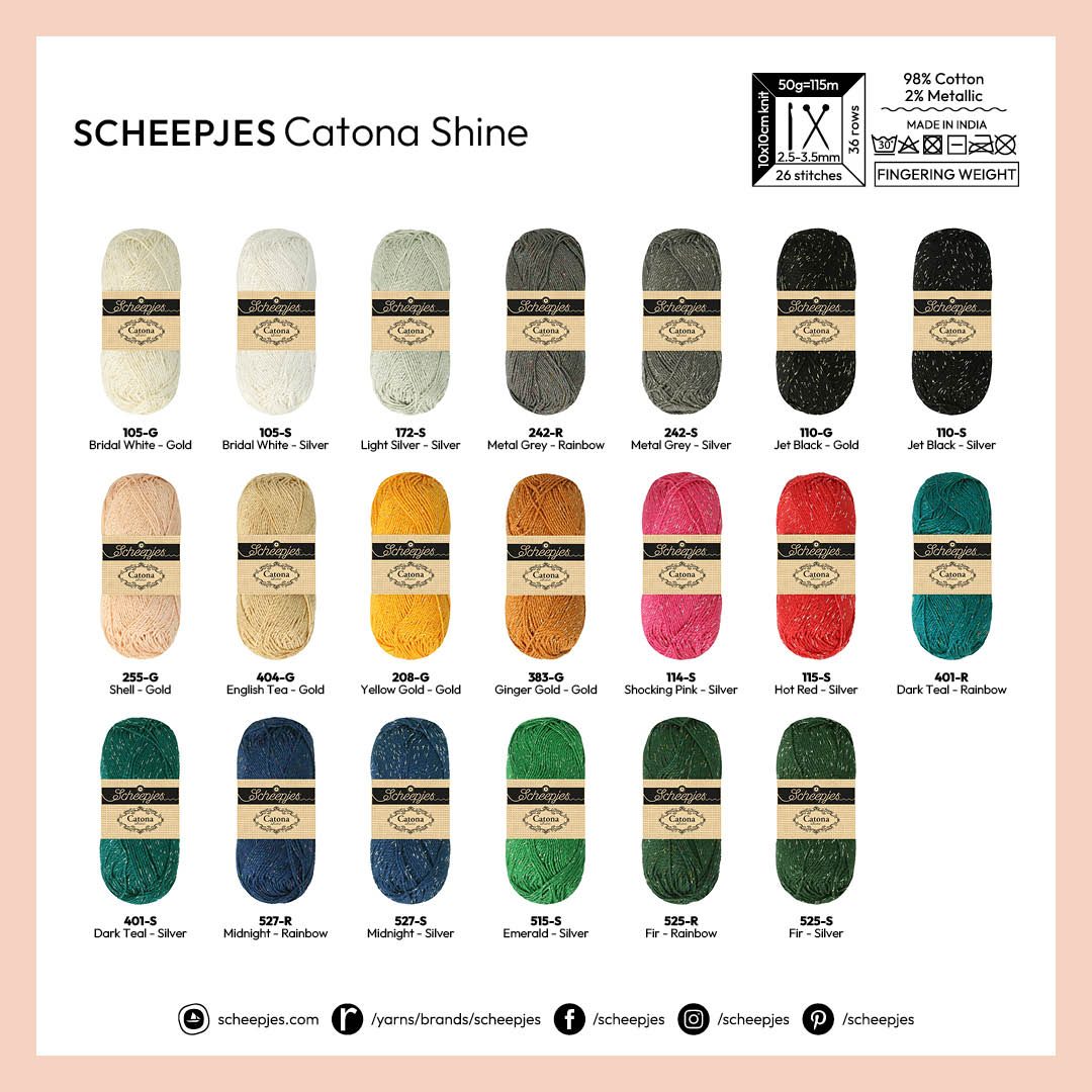 Handig: Catona Shine heeft exact dezelfde stekenverhouding als Scheepjes Catona. Daardoor kun je beide garens moeiteloos samen gebruiken in een patroon. Wissel matte en glanzende delen af voor contrast, of kies een subtiele glittervariant in dezelfde kleur sommige tinten zijn zelfs beschikbaar met zilver-, goud- of regenboogglitter.